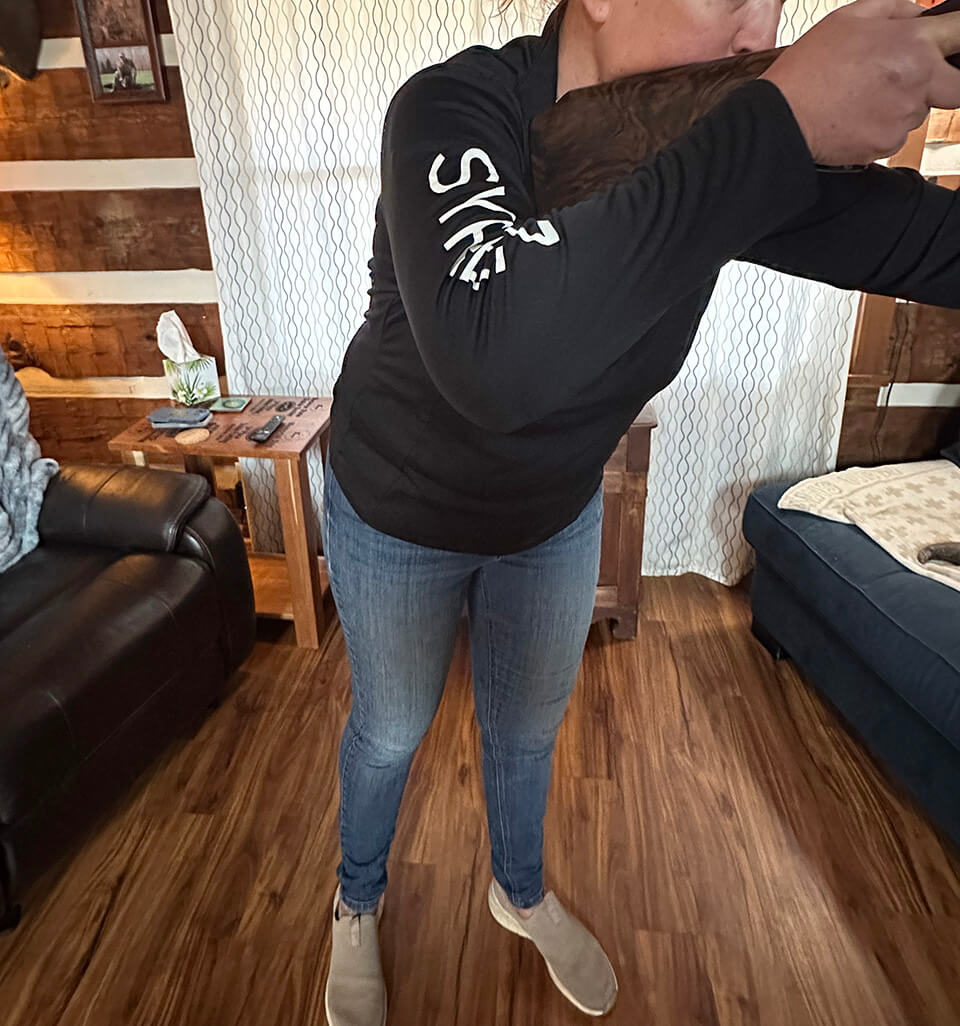 The arms should be slightly bent and relaxed, with elbows pointed down; no chicken wings ladies! While there are no doubt skeet and trap shooters grimacing at my suggestion to keep elbows down, the game of sporting clays and wing-shooting require different stances, since the targets bring a wide array of presentations and aren’t the same exact flight lines over and over and over. Also, the upright elbow lock position is difficult for women, as we don’t have an outer chest wall muscling that men enjoy, allowing them to hold weight out in front of them. Women fatigue faster and have a lower center of gravity – making it more difficult to hold weight directly out in front of our bodies. This is another reason Syren shotguns are built with an excellent balance in forward and rearward weight distribution, making it easier for women to swing and handle these shotguns out in front of them. A gun that is too forward-heavy will be difficult to swing smoothly and a gun that is too rearward-heavy will allow the muzzles to flip up.